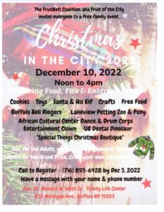 On December 10th, 2022 from noon to 4pm The Fruit Belt Coalition will be hosting a free family event at the Reverend Dr. Bennett W. Smith Sr. Family Life Center. Toys, crafts, games, free food, and fun will be had by all!