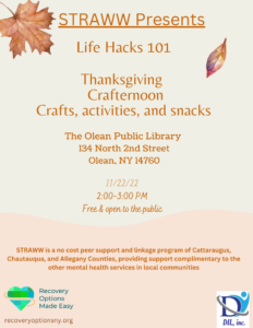 On Saturday, October 22nd, 2022, STRAWW will be holding a Thanksgiving Crafternoon Event! The event will be hosted at the Olean Public Library on 134 North 2nd Street from 2PM-3PM.