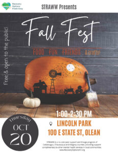 On Thursday, October 20th, 2022, STRAWW will be hosting a Fall Fest at Lincoln Park located at 100 E State St. Olean, NY 14760.